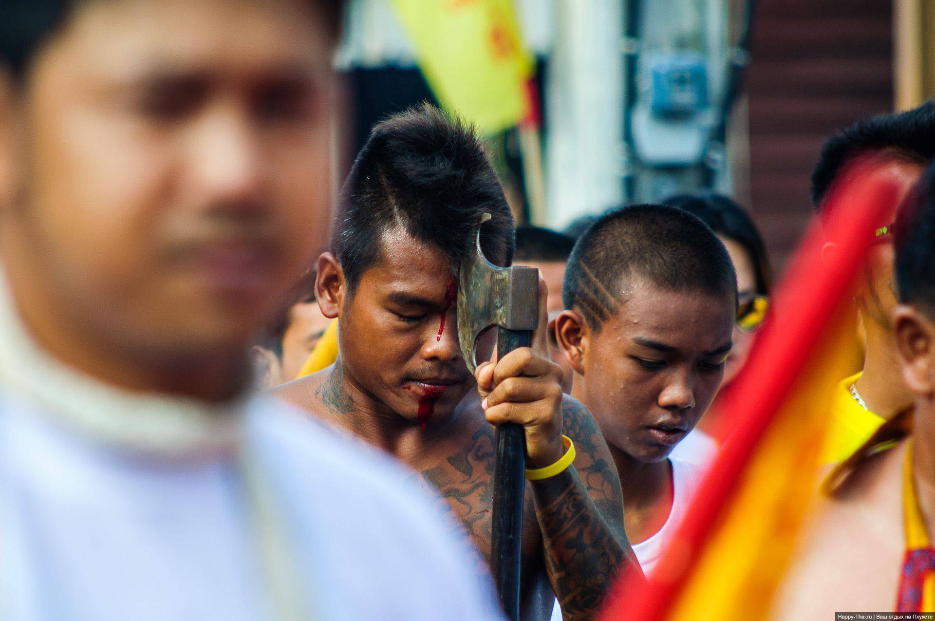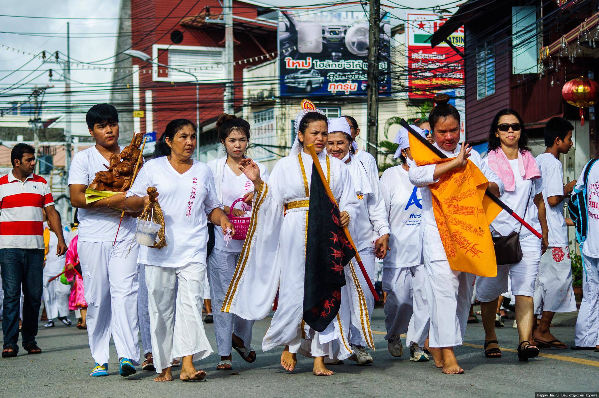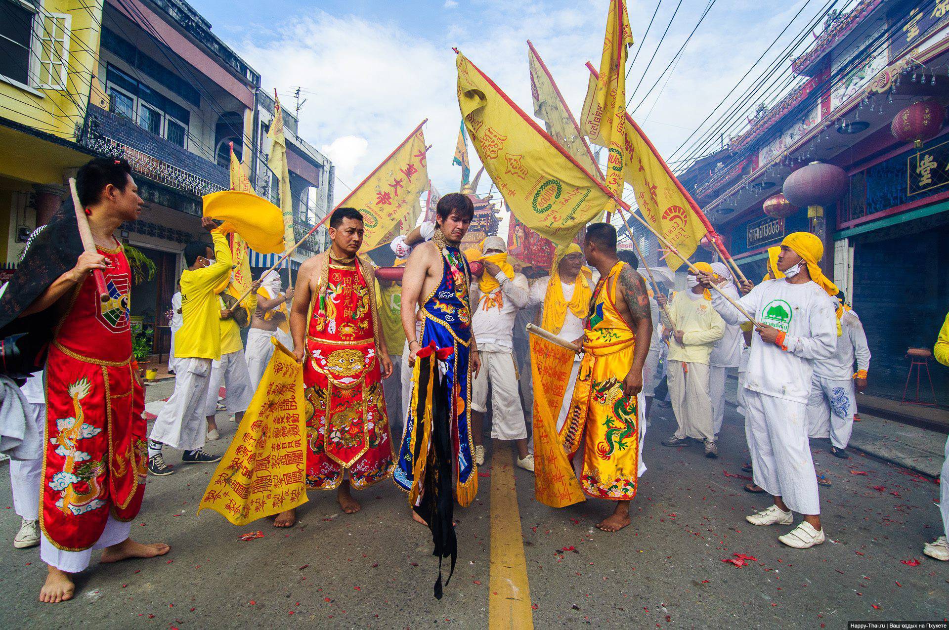 Эти люди, находящиеся в состоянии транса, являются главными героями фестиваля. Проходя по улицам Пхукет тауна до китайского храма, где обычно эти шествия завершаются, такие люди концентрируют вокруг себя огромное количество энергии благодаря своему духовному состоянию и безусловному почитанию всей общиной. Кроме таких шествий каждый вечер также исполняются и другие ритуалы, символизирующие духовное очищение: хождение по углям, обливание кипятком, восхождение по лестнице из лезвий и другое.
